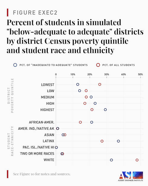 Full participation in this program would cause a decrease in the percentage of students in inadequately funded districts from about 55 percent to 0 percent. In other words, if all states increased state and local investment up to our target “fair share” levels, and roughly $52 billion in new federal aid filled the remaining adequacy gaps, around 26 million schoolchildren would no longer attend schools in inadequately funded districts. These “beneficiaries” and the districts in which they attend schools are a diverse group, as inadequate funding is a widespread problem. But a disproportionate share of our proposal’s beneficiaries attend schools in higher-poverty districts, and almost 60 percent are African American and Latinx students, who make up just over 40 percent of all students in our simulation (see Figure Exec2).