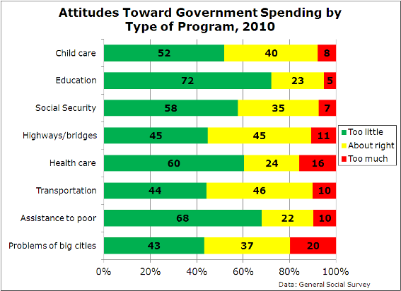 Take a look at the figure below, which presents General Social Survey data for 2010. Each bar presents the distribution of responses to questions of whether the U.S. spends too much (red), about the right amount (yellow) or too little (green) on several different types of programs and public resources.