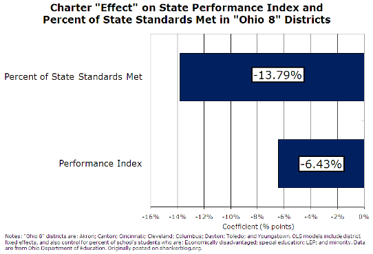 Every year, the state of Ohio releases an enormous amount of district- and school-level performance data. Since Ohio has among the largest charter school populations in the nation, the data provide an opportunity to examine performance differences between charters and regular public schools in the state.