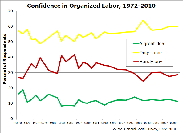 In any case, it’s worth taking a look at how attitudes towards labor have changed over the past few decades. In the graph below, I present simple trend data from the General Social Survey (GSS), which has been administered either annually or semi-annually since 1972. Every year, the GSS queries respondents’ confidence in a number of major societal institutions, including organized labor. Granted, there is a difference between having confidence in unions and supporting them per se, but I think it’s safe to assume that the former is a decent indicator of the latter.