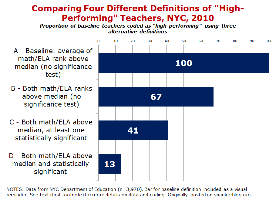 Just to keep this simple, I will lay out four definitions of a “high performing” NYC teacher (or, more accurately, teachers with relatively high value-added scores). I’m not a huge fan of percentile ranks, but I will use them here, for reasons related to data availability (see the first footnote).