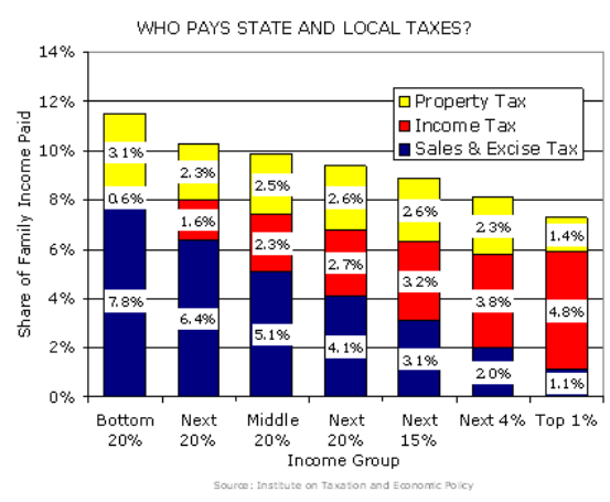 Like federal income taxes, state/local income taxes are progressive – the poorest families pay almost nothing, while the richest pay about five percent. In stark contrast, sales taxes are incredibly regressive – the poorest pay almost eight percent and the richest about one percent. The biggest reason for this is that lower-income families must spend most of their paychecks for living expenses (rather than save it), and so more of their money is “subject” to sales tax. Finally, property taxes are moderately regressive (though the rate is pretty stable until you get to the top one percent).