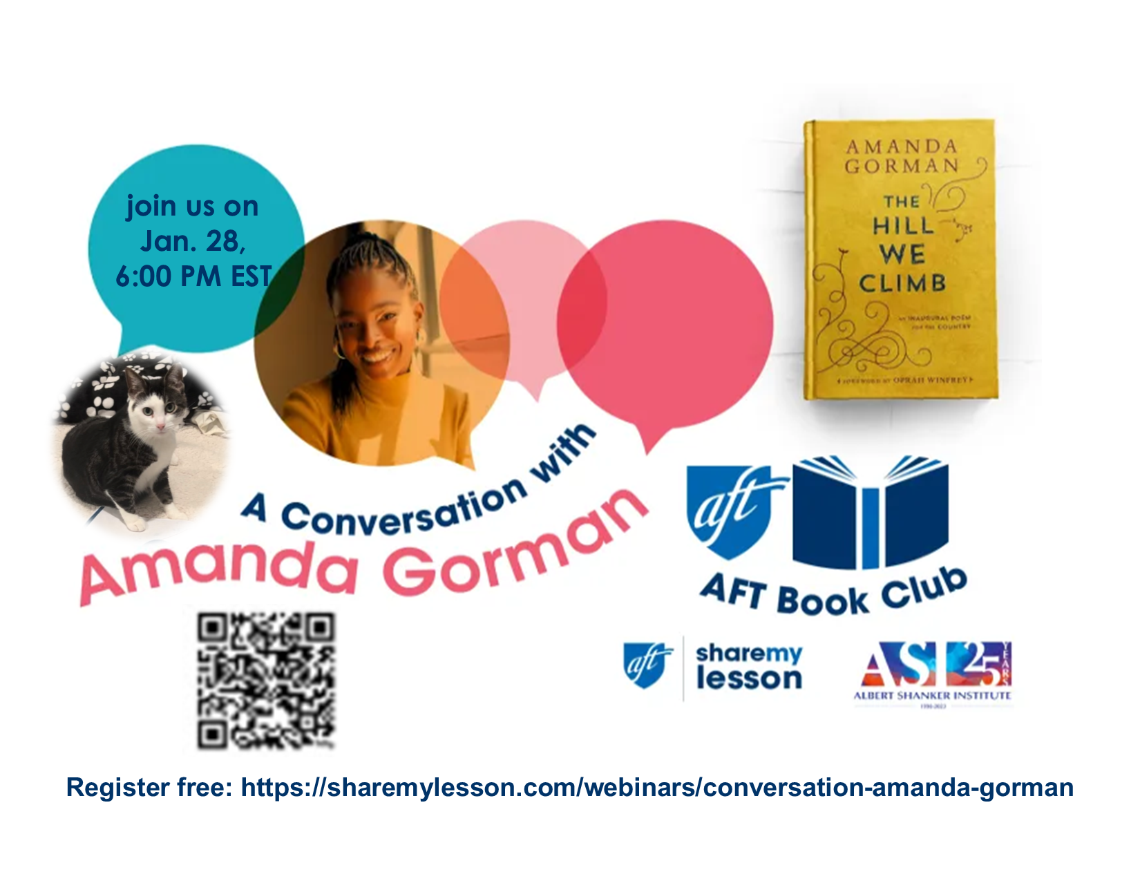 Join poet Amanda Gorman and AFT and ASI President Randi Weingarten on Jan. 28 for the first session of the AFT Book Club Series co-sponsored by the Shanker Institute and ShareMyLesson. This is your chance to delve into the literary universe along with the dynamic Amanda Gorman. Prepare to be enchanted by the fusion of words and wisdom as these two influential figures engage in a riveting dialogue that promises to ignite your passion for literature and social change.