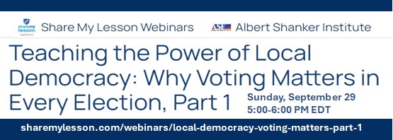 In this webinar, you can explore how to engage new and younger voters through experiential learning approaches like “action civics” and through nonpartisan initiatives aimed at young voter engagement for 2024 and beyond. Join the AFT, Share My Lesson, the Albert Shanker Institute, and Generation Citizen’s RISE Vote 2024 as we discuss effective strategies to elevate local democracy and inspire civic participation in every election.
