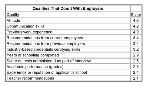 Clearly, most employers give little weight to the last three items, which deal with the performance of students in school. In fact, they are more interested in how many years students spent in school than in what they did while they were there. (See the fifth item from the bottom.) This probably means that employers seldom bother to ask for teacher recommendations or transcripts of grades, and they probably don't pay any attention to where a student went to school. Is there any doubt that the word gets back to students who are still in school that these things don't count? And if they don't count, why should students work hard to get good grades or attend schools with reputations for high standards rather than easy ones?